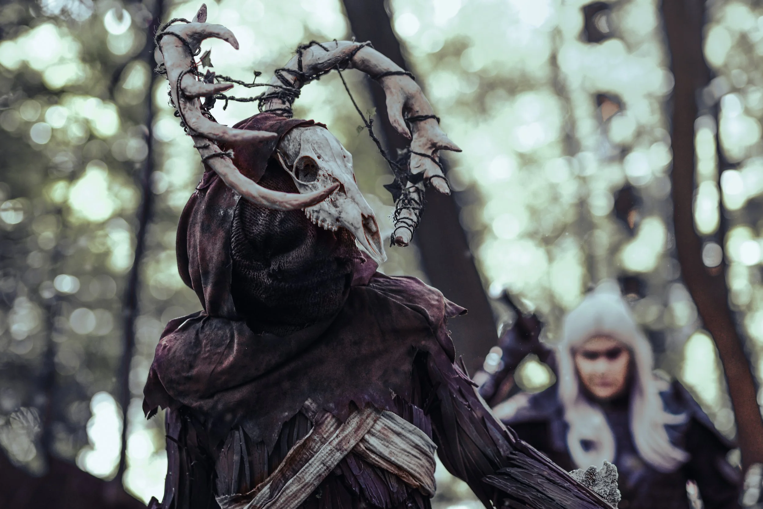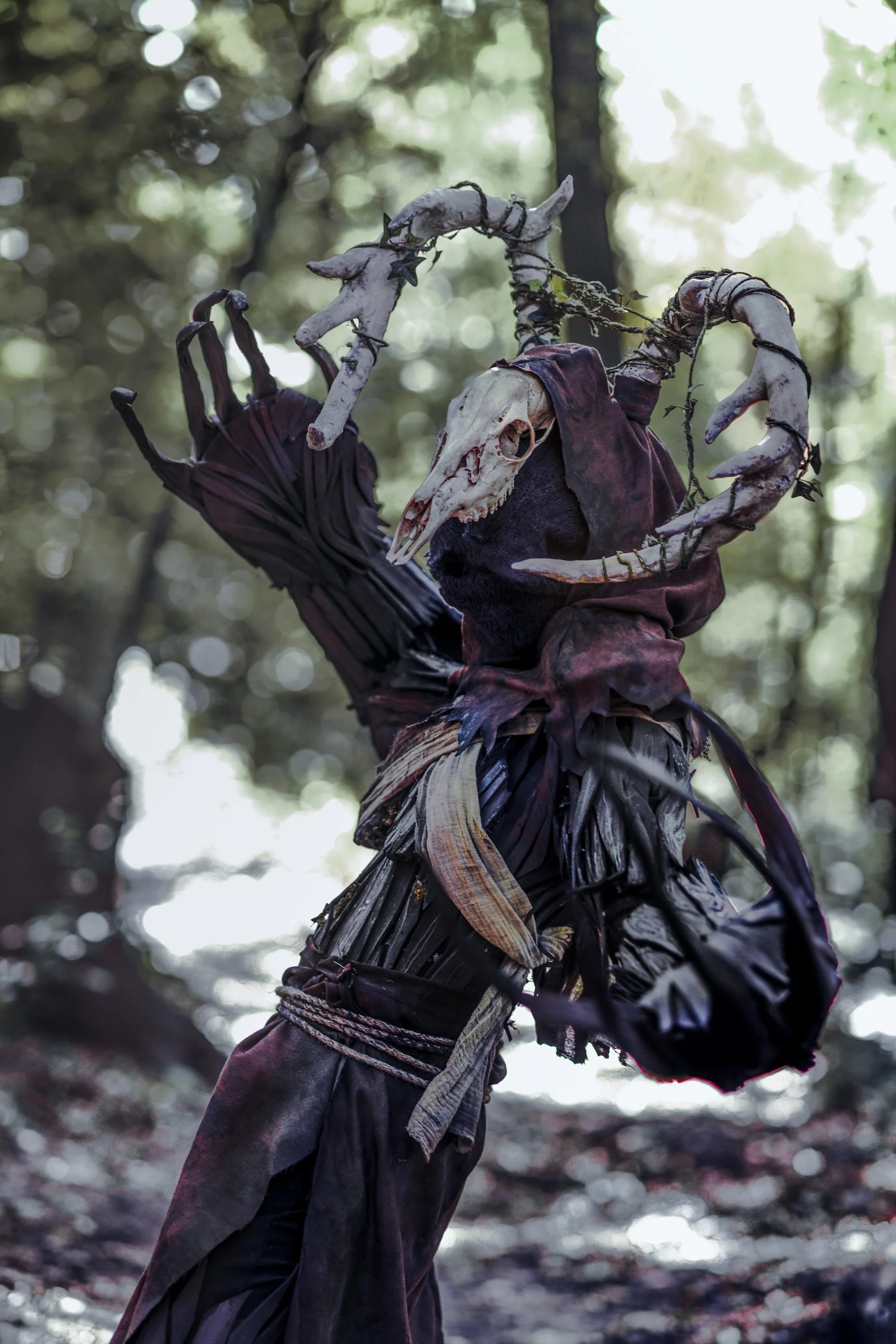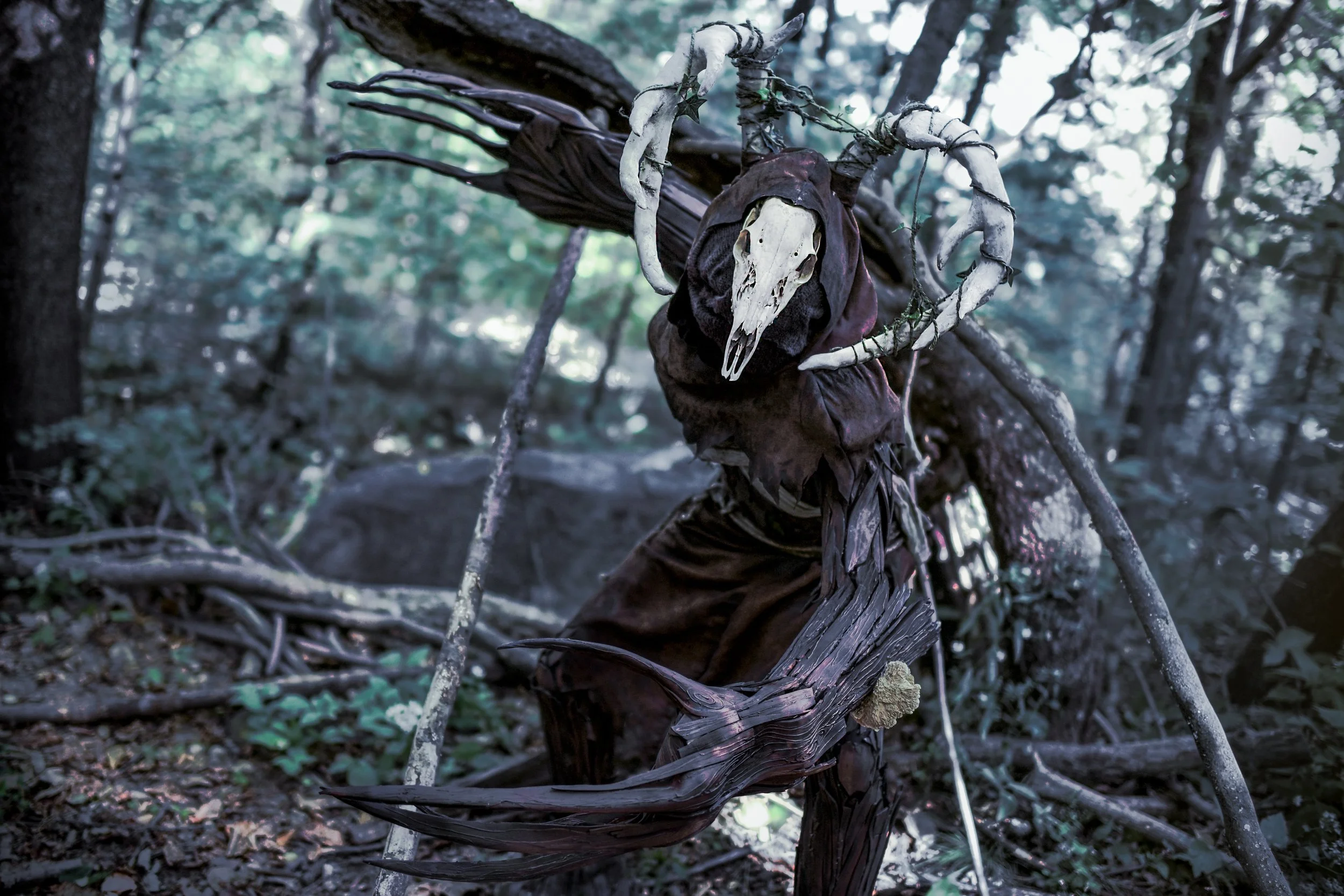 The suit body, and articulated hand puppets were constructed with EVA foam, weathered fabrics, and plant material. Clothing such as the skirt and cowl were machine sewn, and the antlers were sculpted in foam clay.