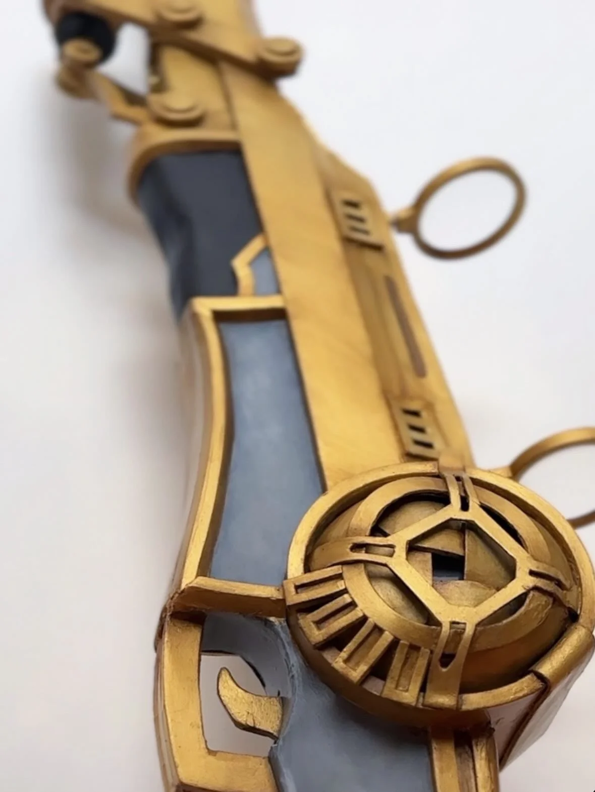 The folding rifle prop is made with a mostly wood core, detailed with EVA foam, and finished with acrylic paint. Total length measures in at 4 feet, 5 inches! A prototype was first made in cardboard to get a feel for the scale and basic mechanics.